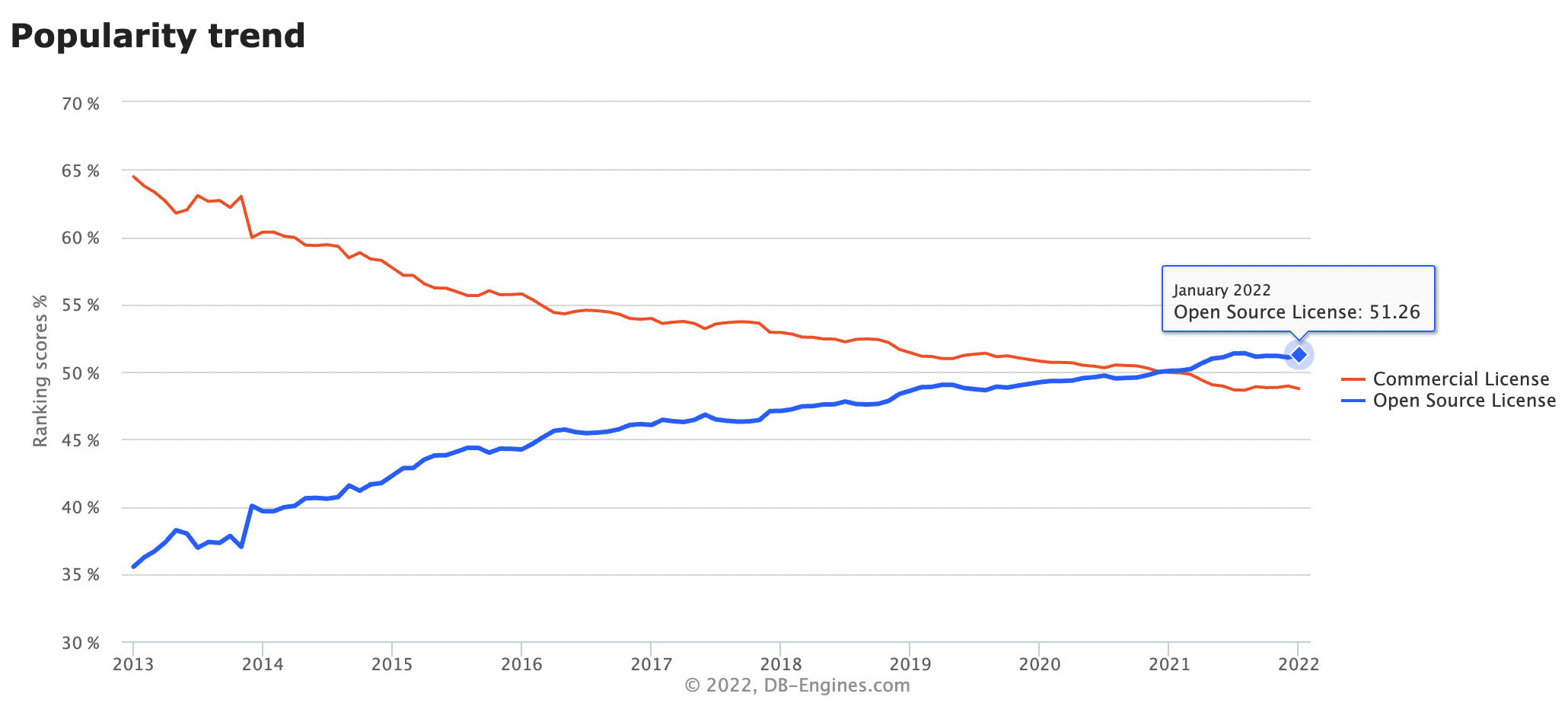 2021년은 역사상 처음으로 오픈소스 데이터베이스가 상용 데이터베이스의 인기를 뛰어넘게 되는 해가 되었습니다.