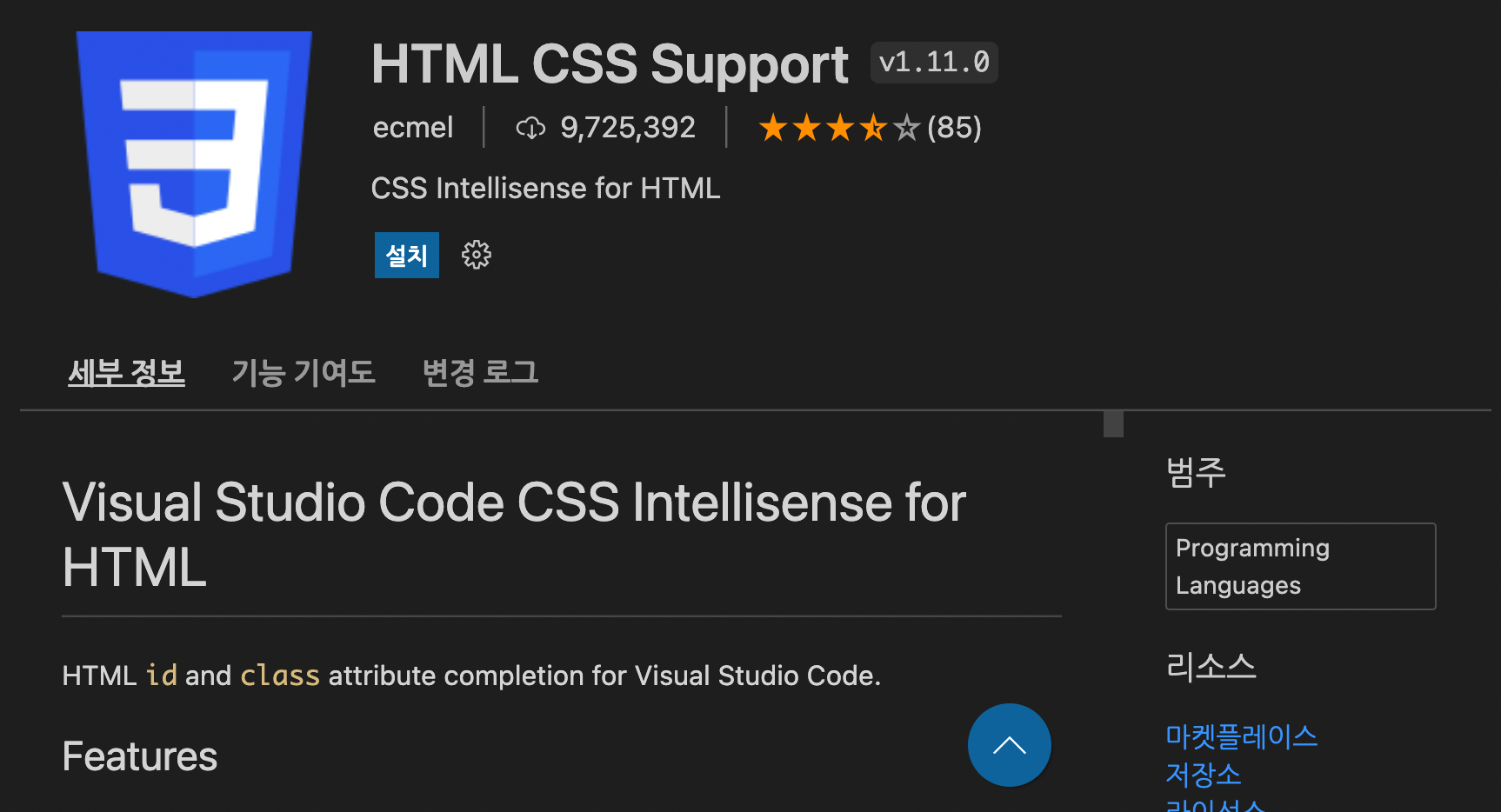 - 자동완성이 잘 작동하지 않는 이슈가 있습니다. 만약 잘 작동하지 않는다면 아래 언급된 HTML CSS Support 를 설치해주세요.