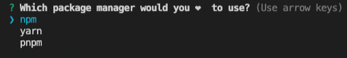 사용할 package manager를 선택합니다. (저는 평소에 사용하던 npm으로 선택하였습니다.)