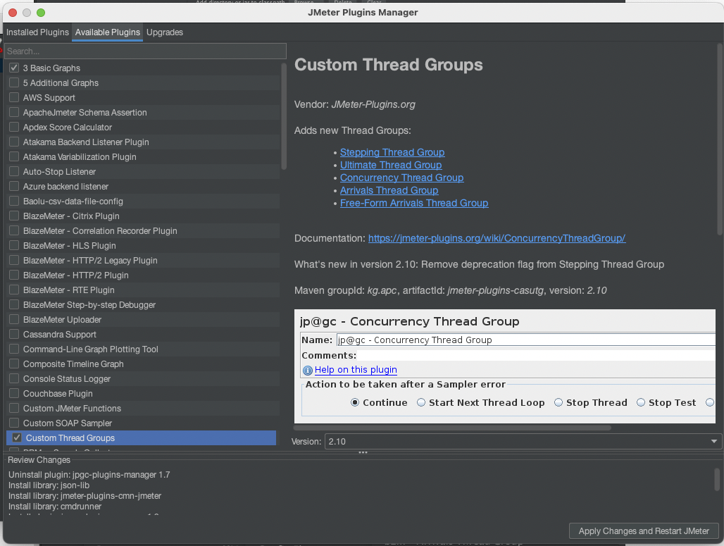 설치할 플러그인을 선택 후 Apply Changes and Restart JMeter를 클릭해주면 된다.