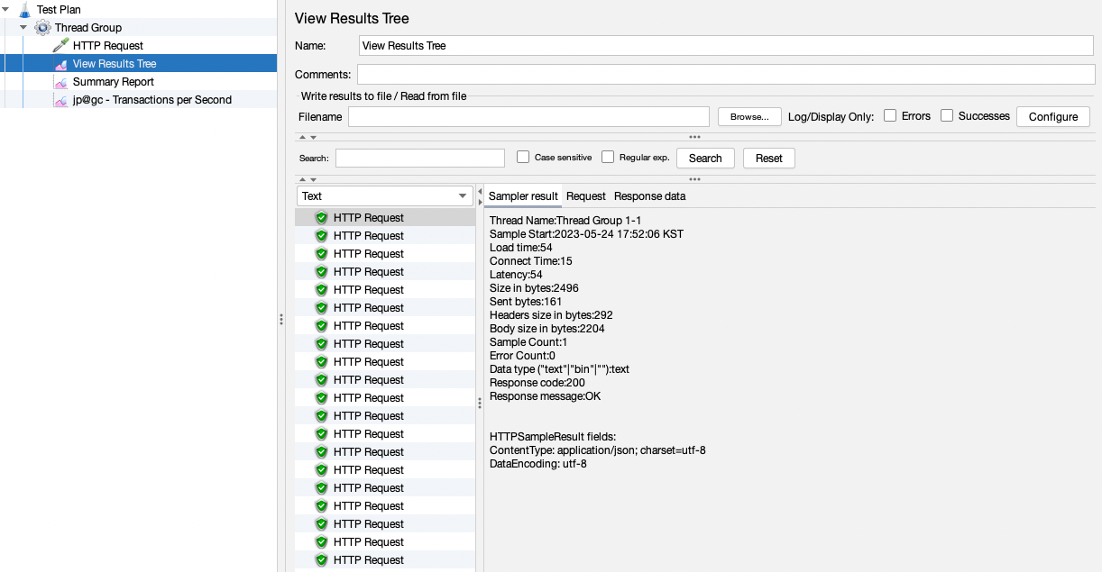 - Thread Group(우클릭) -> Add -> Listener -> View Results Tree