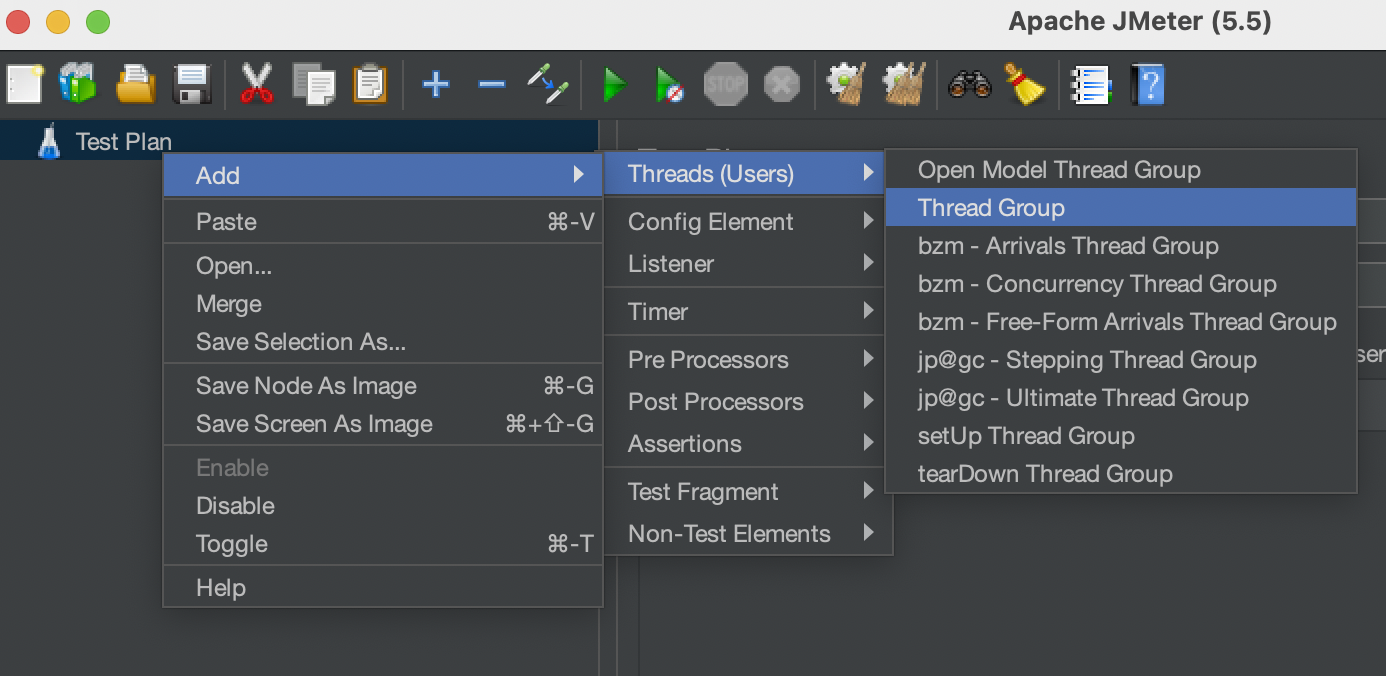 Test Plan(우클릭) -> Add -> Thread Group 추가