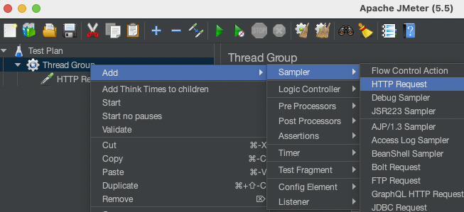 - Thread Group(우클릭) -> Add -> Sampler -> Http Request