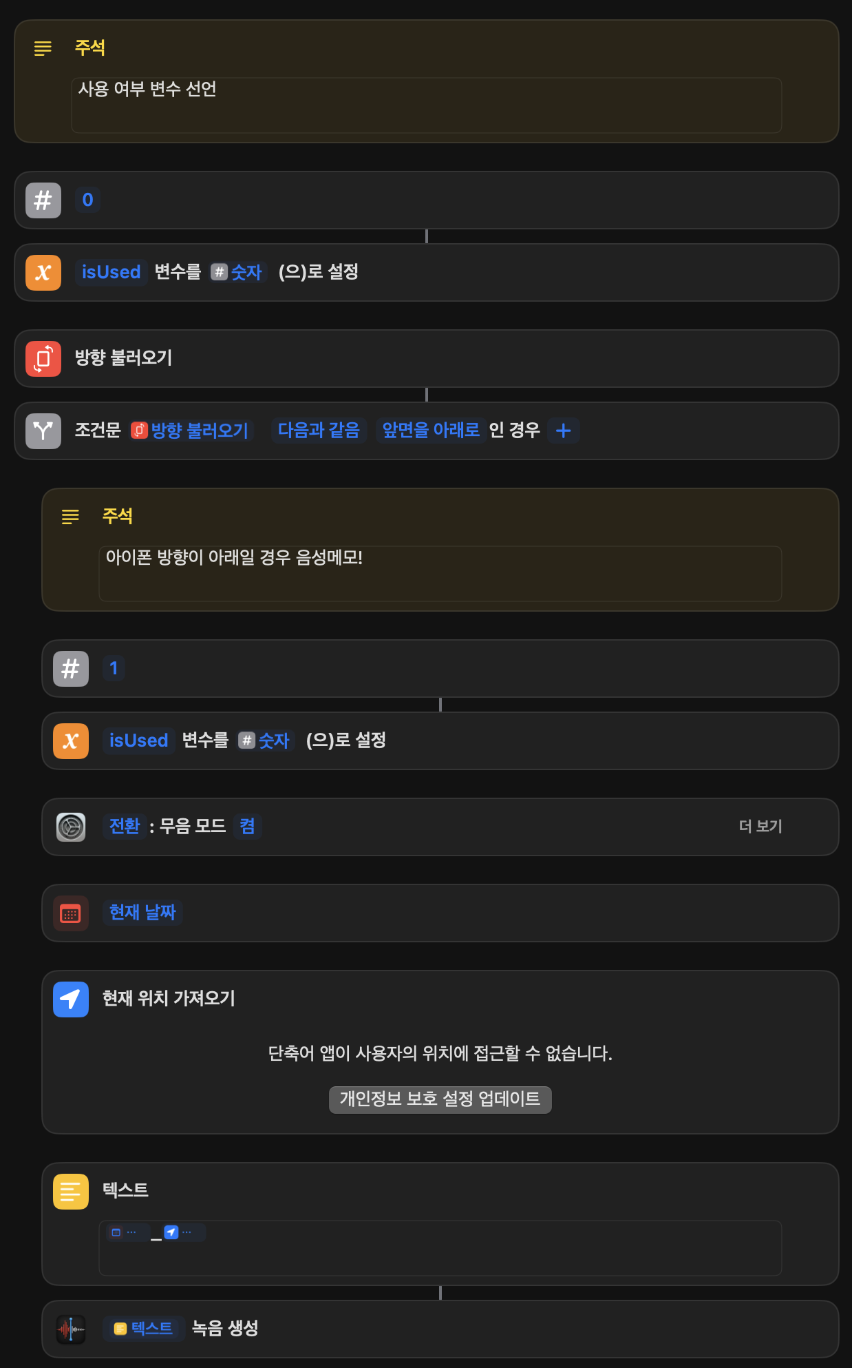 그런데 확인해보니 단축어에는 기기의 "방향 불러오기"가 있어서 만들어봅니다.