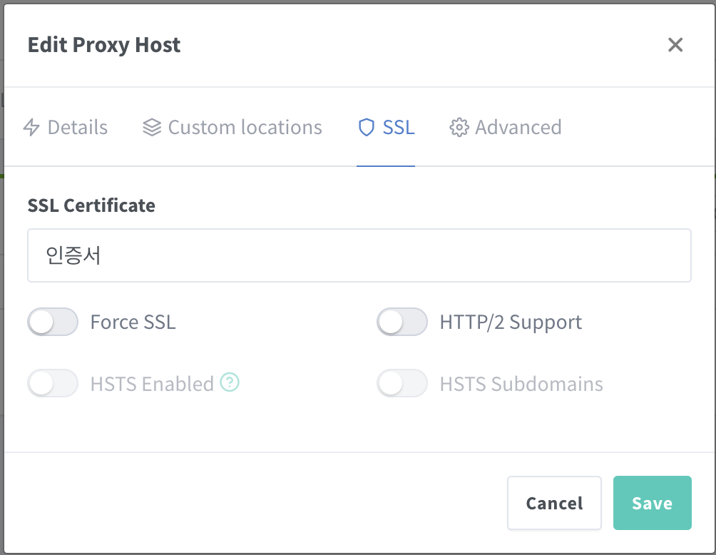 Forward Hostname / IP: 내부 웹 서비스 IP나 호스트 이름 (host.docker.internal)