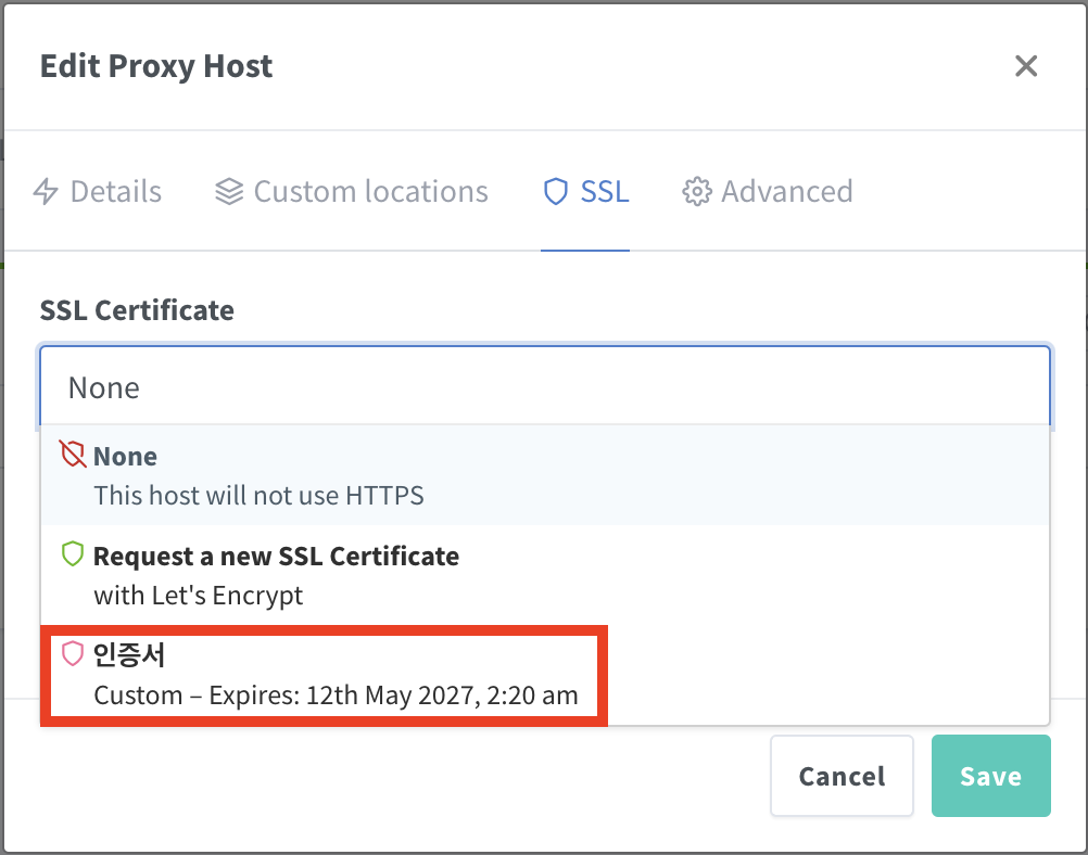 Request a new SSL Certificate 선택시 나오는 추가옵션