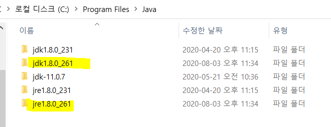 폴더에 들어가면 jdk와 jre가 다운로드 된것을 확인 할 수 있습니다.
