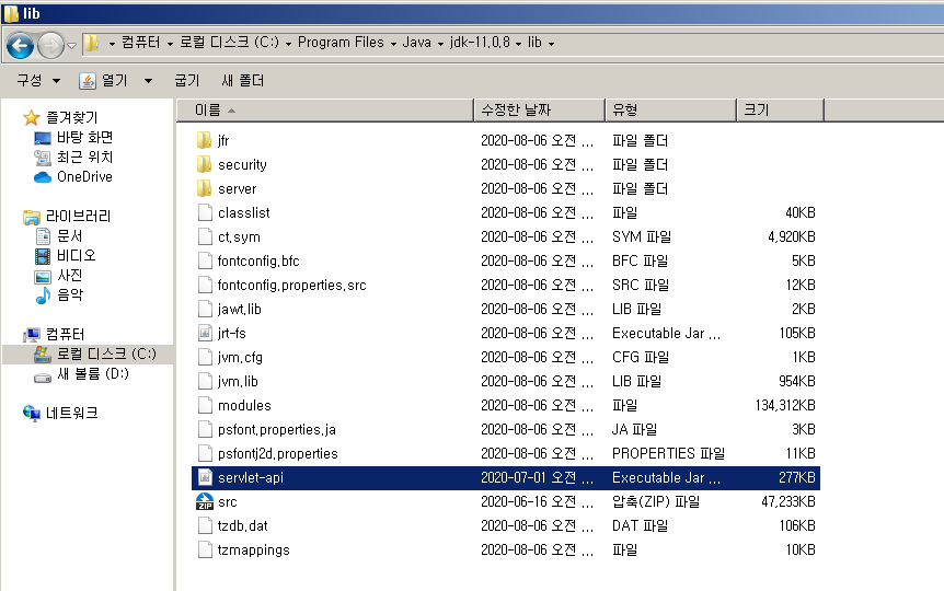 lib : 서블릿 클래스들이 구동되는 데 필요한 추가 라이브러리 파일들을 넣는 곳