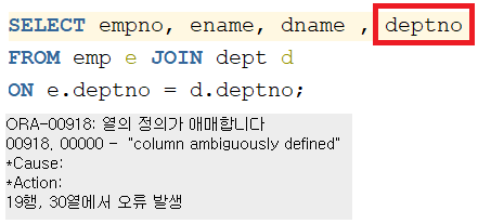 : 하지만 양 쪽 테이블에 모두 있는 컬럼일 경우 반드시 테이블 이름을 적어야함