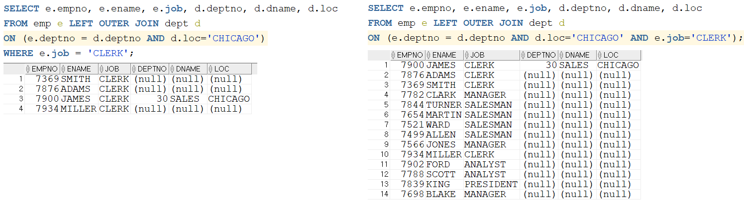 : ON절에 기술한 조건은 기준 집합 중에 아우터 조인 대상이 되는 집합을 말하는 것