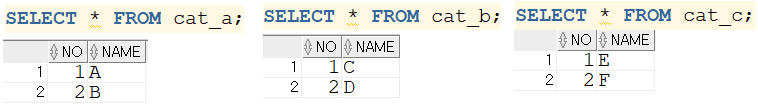 CREATE TABLE cat_a (no NUMBER, name VARCHAR2(1));