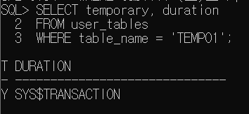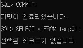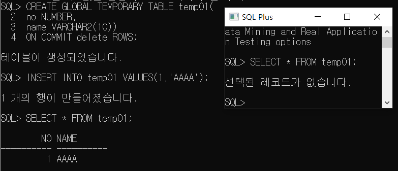 - ON COMMIT delete ROWS를 설정해 놓았기 때문에 COMMIT을 하는 순간 데이터가 지워진다.