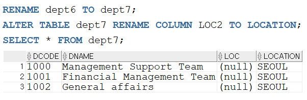 ALTER TABLE 테이블명 RENAME COLUMN 컬럼명 TO 바꿀명;