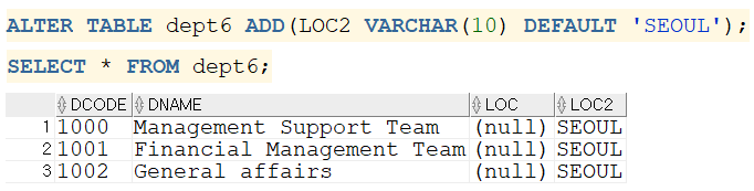 ALTER TABLE 테이블명 ADD(컬럼명 데이터타입);