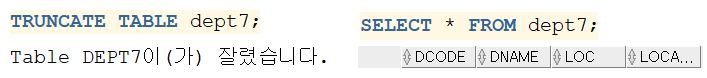 : 테이블의 데이터를 전부 삭제하고 사용하고 있던 공간을 반납하는 명령어
