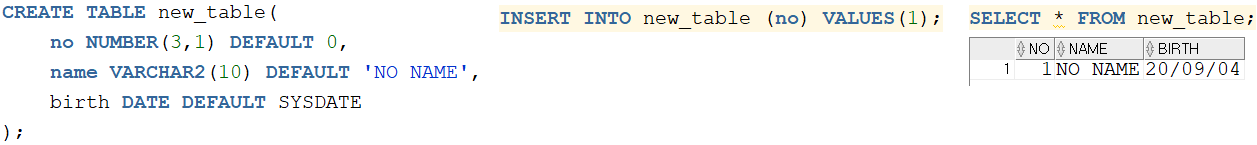 - DEFAULT는 사용자가 값을 입력하지 않을 경우 DAFUALT 뒤에 적힌 값을 자동으로 넣으라는 의미
