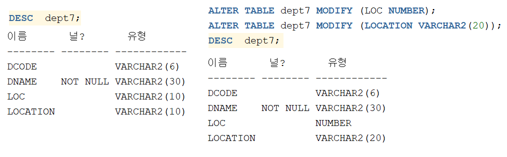 ALTER TABLE 테이블명 MODIFY(컬럼명 데이터타입(크기));