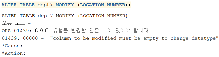 : 위에 LOC처럼 컬럼의 데이터 타입도 변경 가능하지만, 해당 컬럼이 데이터를 가지고 있지 않아야 함.
