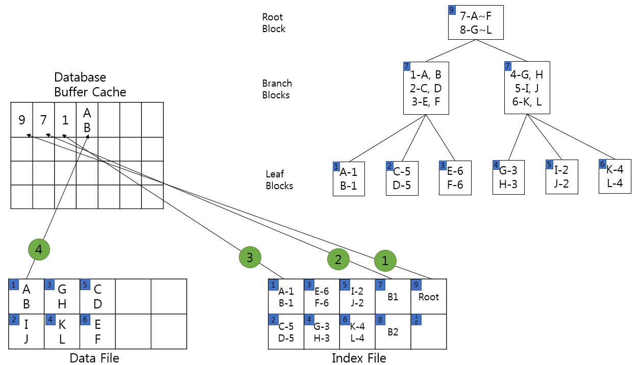 1. 위 오른쪽 그림에서 가장 위에 있는 Root Block을 Index File에서 Database Buffer Cache로 가져와서 사용자가 찾는