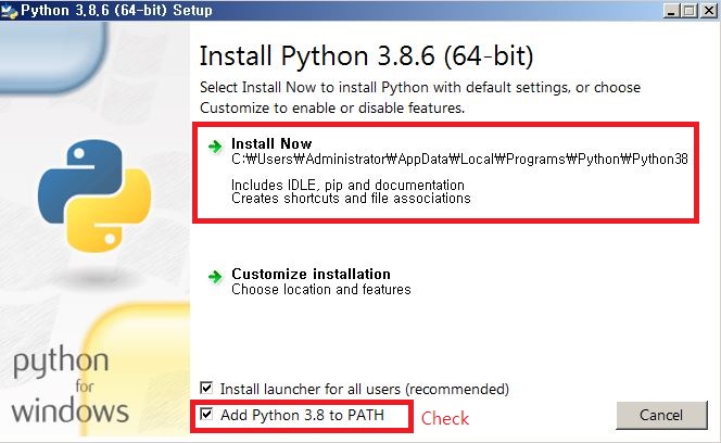 Add Python 3.8 to PATH 체크 후 Install