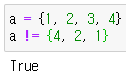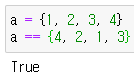 : 세트는 요소의 순서가 정해져 있지 않으므로 각 요소만 같으면 True