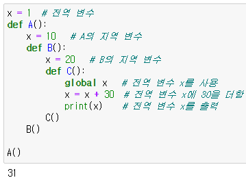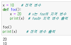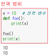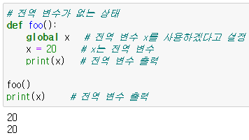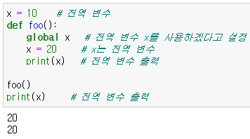 : 만약 전역 변수가 없을 때 함수 안에서 global을 사용하면 해당 변수는 전역 변수가 됨