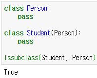 : 기반 클래스의 파생 클래스가 맞으면 True, 아니면 False를 반환