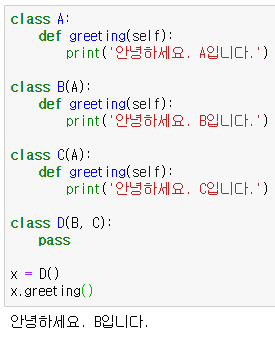 : 파이썬은 다중 상속을 한다면 왼쪽에서 오른쪽 순서로 메서드를 찾음