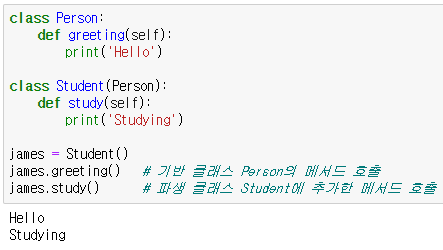 : Student클래스에는 greeting 메서드가 없지만 Person 클래스를 상속받았으므로 greeting메서드를 호출할 수 있음
