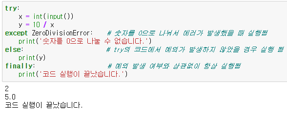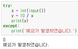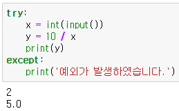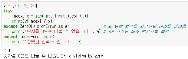 : 모든 예외의 에러 메시지를 출력하고 싶다면 except에 Exception을 지정하고 as 뒤에 변수를 넣으면 됨