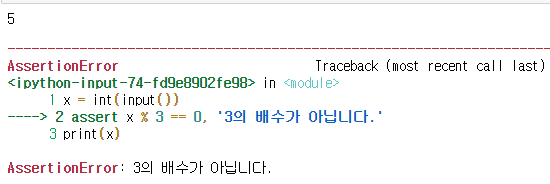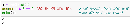 : 지정된 조건식이 거짓일 때 AssertionError 예외를 발생시키며 조건식이 참이면 ㄱ그냥 넘어감