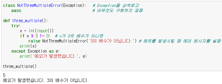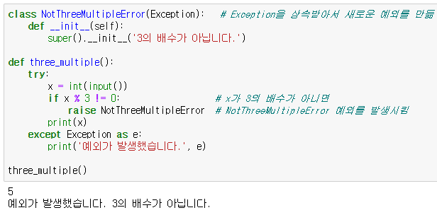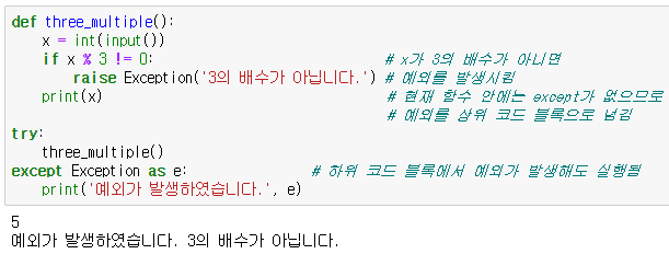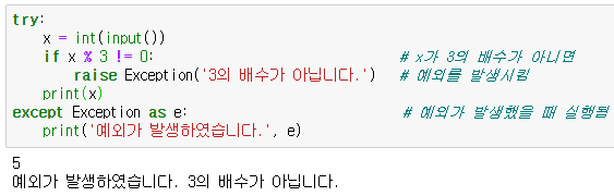 : raise로 예외를 발생시키면 raise 아래에 있는 코드는 실행되지 않고 바로 except로 넘어감