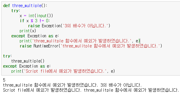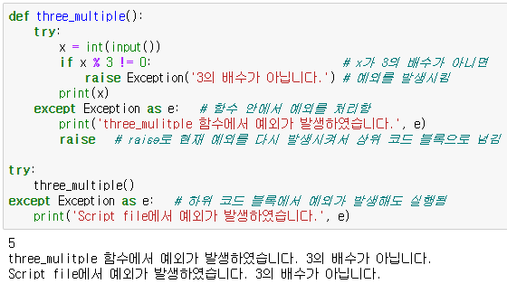 : raise만 사용하면 같은 예외를 상위 코드 블록으로 넘기지만