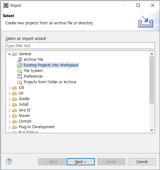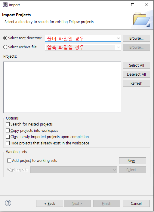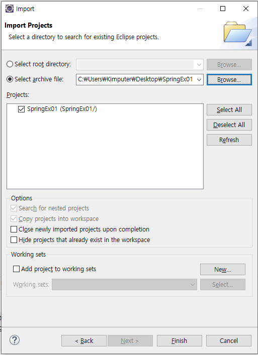 : Existing Projects into Workspace - 프로젝트를 불러옴 경우(압축된 프로젝트 포함)